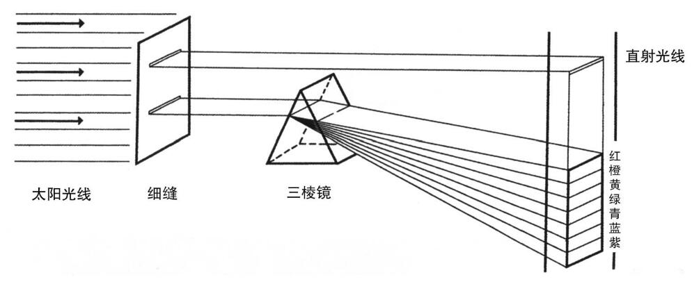 色彩的形成離不開光的作用,當(dāng)光刺激眼睛時,就會使視覺產(chǎn)生色彩的概念,也就有了現(xiàn)在的這個被色彩渲染得五顏六色的世界,簡單地說,色彩是一種視知覺,是光作用于眼睛的結(jié)果。如果讓束白光從狹縫射入黑色的房間,并且使光穿過三棱鏡,這時會發(fā)現(xiàn)白光被分離成紅、橙、黃、綠、青、藍(lán)、紫等各種顏色的光,這就是能看到各種不同顏色物體的原因,如圖10.1所示。