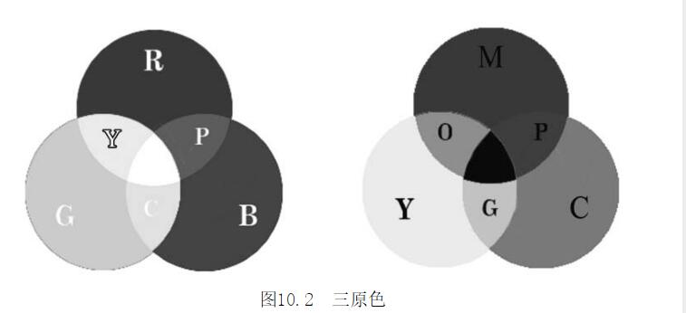 當(dāng)被分解的紅、橙、黃、綠、青、藍(lán)、紫等顏色的光再次經(jīng)過三棱鏡時不再發(fā)生光的分解現(xiàn)象,這樣的光就被稱為單色光。而紅色、綠色、藍(lán)色的光被稱為三原色光。自然界的任何色光都可以由定比例的三原色光組合而成,如紅色光和綠色光混和可以產(chǎn)生黃色光,紅色光和藍(lán)色光混和可以產(chǎn)生品紅色光,藍(lán)色光和綠色光混和可以產(chǎn)生青色光,紅橙黃綠青藍(lán)紫光、綠色光、藍(lán)邑光三者等量混和可以產(chǎn)生白色光,如圖10.2所示。