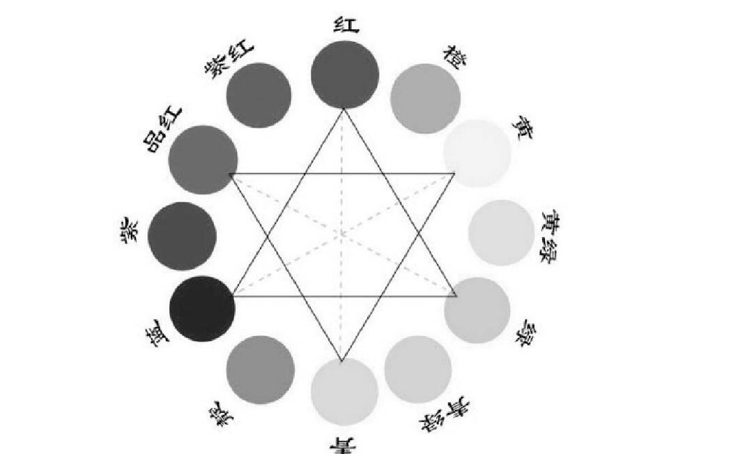 色輪是表示最基本色相關(guān)系的色表。色輪上90。角內(nèi)的幾種色彩稱作同類色,也叫近鄰色或姐妹色。90。角以外的色彩稱為對比色。色輪上相對位置的色叫補(bǔ)色,出叫相反色,如圖10-6所示。