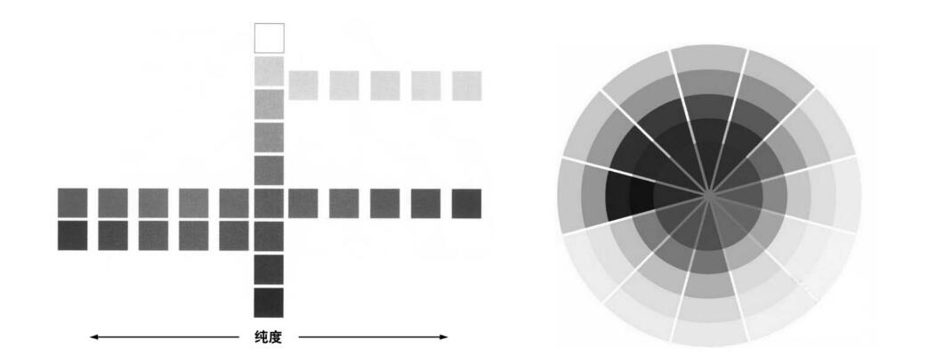 一種色相純度,也有強(qiáng)弱之分,拿正紅來說,有鮮艷無雜質(zhì)的純紅,也有較淡薄的粉紅,但它們的色相都相同.只是強(qiáng)弱不。純度常用高低來描述.純度越高,色越純,越艷;純度越低,色越澀,越濁。純色是純度最高的級。色彩純度的高低受物體表面結(jié)構(gòu)、照射光源的特點(diǎn)以及視覺生理特性的影響。關(guān)于色彩純度的變化如圖10-7所示。