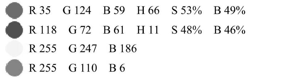 選用了組紅綠對比色,極賦視覺沖擊力,所表現(xiàn)出的性格異常鮮明。我們看到RGB中綠色的數(shù)值顯示情況符合復(fù)色的條件,因此注定了該顏色明度稍晤、純度較低的特性,而紅色R數(shù)值118構(gòu)成了該色的主要成分,其他G72、B61數(shù)值接近,純度和亮度相對綠色較高,因此2色在構(gòu)成色彩空間差距上拉大。HSB中2色的S數(shù)值也顯示出,它們的飽和度相差較大。