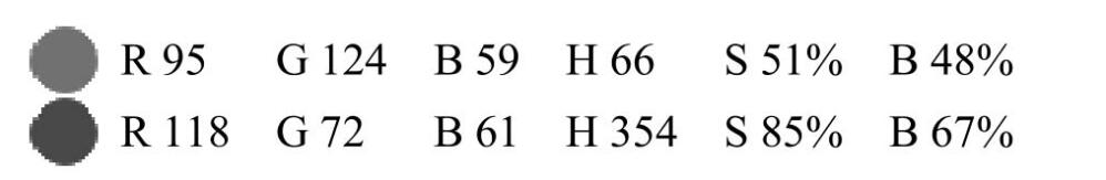 深綠和赭石這兩種復(fù)色的數(shù)值都是個分量最多的3位數(shù),另外兩者成分相當(dāng),都為兩位數(shù)組合而得。RGB之間的數(shù)值差距較接近、不明顯,色階較趨于直線平穗,呈灰階。HSB中SB顯示的數(shù)值也非常接近,成為符合復(fù)色特性的必須條件。