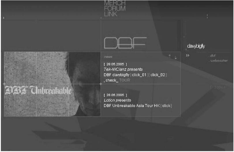 整個頁面效果如同古老的黑白照。初看該頁面容易把背景的源灰色誤認為是黑色,再仔細觀看就感覺到了此種深灰色不凡的作用,假如背景色使用了黑色,頁面的主體人物和空間感的相互作用就變得僵硬且呆板。