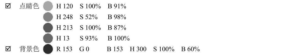 紫色的HSB數(shù)值H色相為300度時(shí)是正紫色。圖10 38的HSB模式S數(shù)值顯示,上組顏色飽和度基本都比較高,加上部分較高的明度組合,使該頁(yè)面異常奢華艷麗。