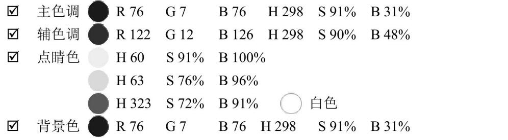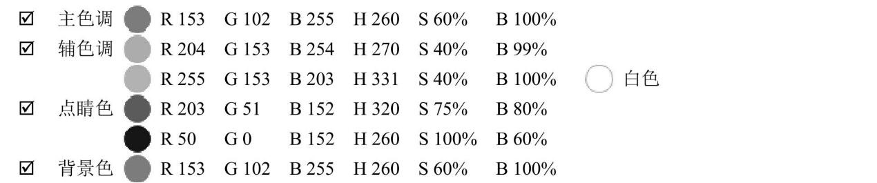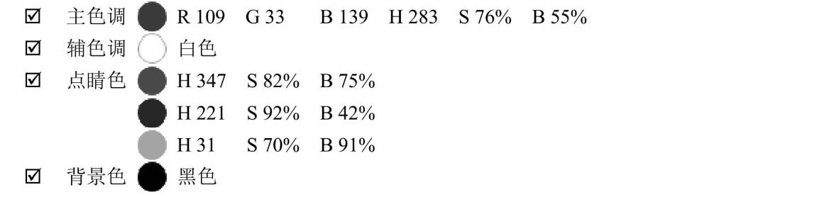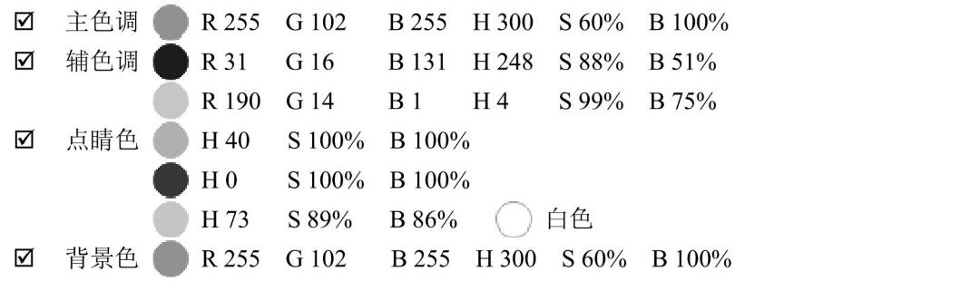 輔色調(diào)HSB的H色相數(shù)值為270,已經(jīng)稍往紫色偏移,紫色特征較明顯,明度較而且較明快的感覺(jué)。另輔助色粉紅色H色相數(shù)值為331稍往紅色系偏移,明度極高為100%,更增添了明快的氣息。