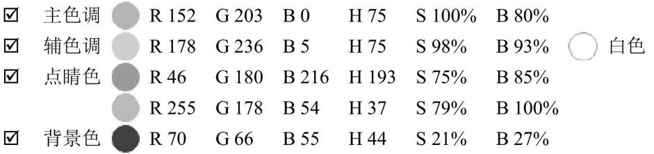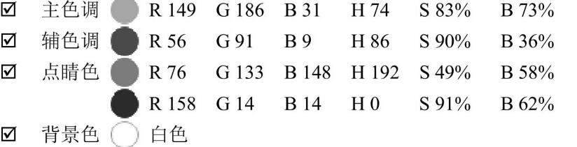從HSB模式的數(shù)值看,主色調(diào)是接近于黃色的基礎上加入了少許綠色,飽和度和明度降低,色彩看起來較柔和。輔色調(diào)墨綠色的綠色的傾向稍高,飽和度也較高,只是明度降低,該色看起來踏實沉穩(wěn)。