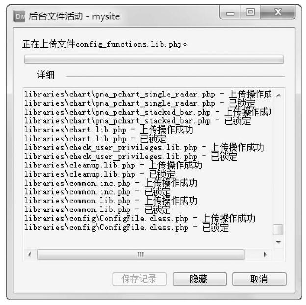 在這個后臺文件活動日志中,用戶可以查看哪些文件上傳成功,哪些文件上傳失敗,以便即時采取措施,繼續(xù)上傳失敗的文件。當網(wǎng)站內容很多時,網(wǎng)站上傳會持續(xù)很長時間,這時用戶可以隱藏【后臺文件活動】對話框,讓文件上傳在后臺繼續(xù)操作,這樣就可以繼續(xù)執(zhí)行其他任務。
