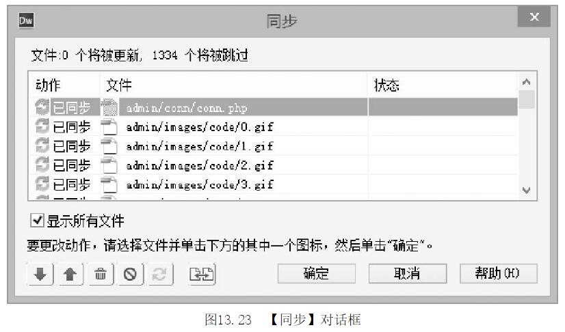 第11步,如果每個選定文件的最新版本都己位于本地和遠程站點并且不需要刪除任何文件,則將顯示提示對話框,提示無須進行任何同步。否則將顯示【同步】對話框,允許用戶是否把最新的文件上傳到遠程服務器,如圖13-23所示。
