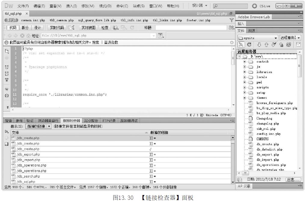第3步,在Dreamweaver主窗口底部將打開【結(jié)果】面板組,從中選擇【鏈接檢查器】面板,如圖13-30所示