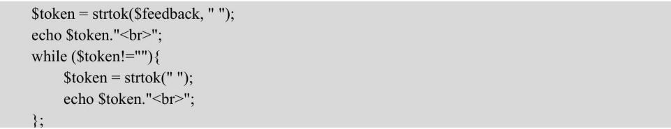 以上代碼是從$email_array中取出數(shù)組元素,然后用第一個(gè)傳入的參數(shù)字符將它們連接在一起。這個(gè)函數(shù)的調(diào)用同explode()十分相似,但效果卻相反。與函數(shù)explode()每次都將一個(gè)字符串全部分割成若干小塊不同,strtok()函數(shù)一次只從字符串中取出一些片段。對(duì)于一次從字符串中取出一個(gè)單詞的處理來說,strtok()函數(shù)比explode()函數(shù)的效果更好。strtok()函數(shù)的基本語法如下:stringstrtok(stringinput,stringseparator);