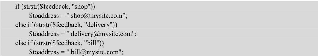 首先,這段代碼將檢查反饋信息中特定的關(guān)鍵字,然后將郵件發(fā)送給適當(dāng)?shù)娜?。函?shù)strstr()有兩個變體。第一個變體是stristr(),它幾乎和strstr()一樣,其區(qū)別在于不區(qū)分字符大小寫。對于智能表單應(yīng)用程序來說,這個函數(shù)非常有用,因?yàn)橛脩艨梢暂斎雂elivery、Delivery或DELIVERY,以及其他大小寫混合的情況。第二個變體是strrchr(),它與strstr()一樣,但strrchr()會查找指定字符在字符串中最后一次出現(xiàn)的位置。函數(shù)strpos()和strrpos()的操作和strstr()類似,但它不是返回一個子字符串,而是返回目標(biāo)關(guān)鍵字子字符串字符串在被搜索字符串中的位置。更有趣的是,現(xiàn)在的PHP手冊建議使用strpos()函數(shù)替代strstr()函數(shù)來查看一個子字符串在一個字符串中出現(xiàn)的位置,因?yàn)榍罢叩倪\(yùn)行速度更快。函數(shù)strpos()的基本語法如下:intstrpos(stringhaystack,stringneedle,int[offset]);