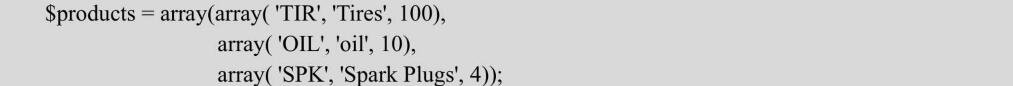 從這個定義中可以看出$products數組包含3個子數組。前面介紹過,訪問一維數組中的數據時,需要使用數組的名稱和元素的索引。除了一個元素具有兩個索引(行和列)外,二維數組和一維數組是類似的(最上邊的是第0行,最左邊的是第0列)。