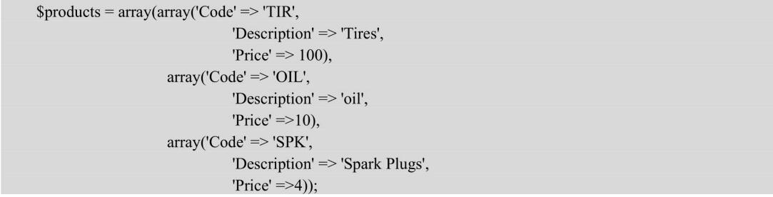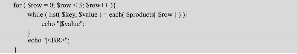 【示例6】使用for循環(huán)遍歷外部的數字索引數組$products。$products數組的每一行都是一個具有描述性索引的數組。在while循環(huán)中使用each()和list()函數,可以遍歷整個內部數組。因此,需要一個內嵌有while循環(huán)的for循環(huán)。
