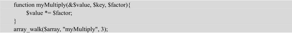 在這個例子中,瀏覽器中的輸出結(jié)果就會是:3、2、1。使用each()、current()、reset()、end()、next()、pos()和prev(),可以編寫出自己的、能按任何順序瀏覽數(shù)組的代碼。有時候,讀者可能希望以相同方式使用或者修改數(shù)組中的每一個元素。array_walk()函數(shù)允許進行這樣的操作。函數(shù)array_walk()的原型如下: