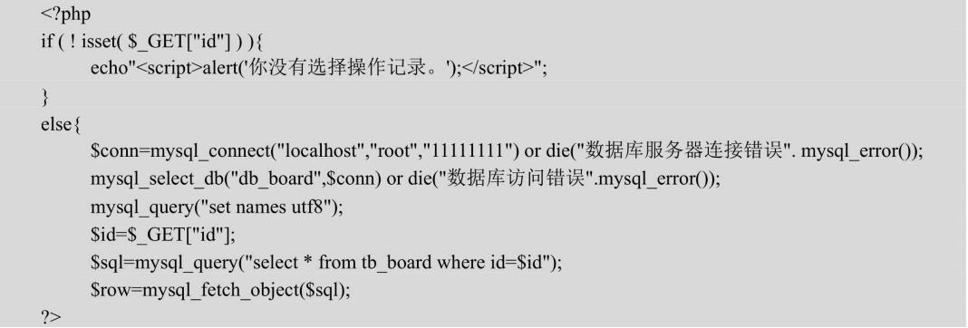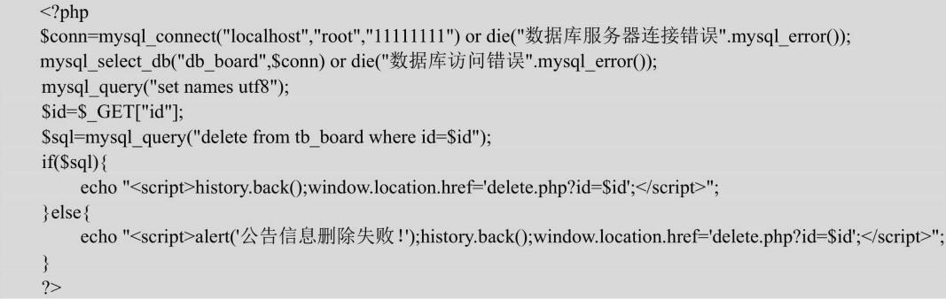 第3步,新建check_del.php文件,在該文檔中根據(jù)超鏈接傳遞過(guò)來(lái)的id值,執(zhí)行DELETE刪除語(yǔ)句,刪除數(shù)據(jù)表中指定的公告信息。具體代碼如下: