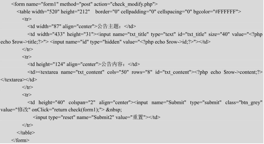 第4步,在該頁(yè)面中添加表單結(jié)構(gòu),并把對(duì)應(yīng)的字段值綁定到文本框和文本區(qū)域中,同時(shí)添加一個(gè)隱藏域、提交按鈕和重置按鈕,設(shè)置<form>標(biāo)簽的action的屬性值為check_modify.php文檔。具體代碼如下: