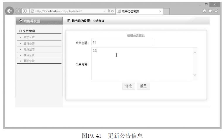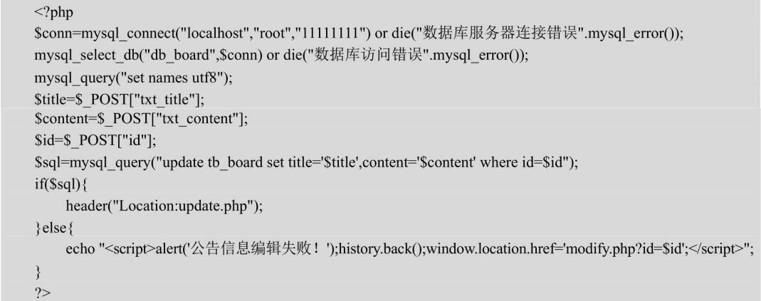 第5步,新建check_modify.php文檔,在該文檔中清除所有的HTML結(jié)構(gòu)代碼,輸入下面代碼。當(dāng)運(yùn)行示例代碼,在index.php頁(yè)面單擊編輯公告超鏈接,進(jìn)入到update.php頁(yè)面,在該頁(yè)面中單擊其中任意一條公告信息后的編輯圖標(biāo),進(jìn)入modify.php頁(yè)面,在該頁(yè)面顯示指定的公告信息,并被綁定到表單域中,此時(shí)用戶(hù)就可以對(duì)其進(jìn)行編輯,編輯完畢,最后單擊【修改】按鈕,由check_modify.php文檔負(fù)責(zé)把編輯后的信息重新寫(xiě)入到數(shù)據(jù)庫(kù)中,實(shí)現(xiàn)對(duì)數(shù)據(jù)的更新操作,運(yùn)行結(jié)果如圖19.41所示。