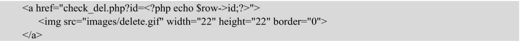 第2步,新建delete.php頁(yè)面,在該頁(yè)面中使用SELECT語(yǔ)句檢索出全部的公告信息,使用do…while循環(huán)語(yǔ)句通過(guò)表格形式輸出顯示,并在每條記錄后面添加一個(gè)單元格,插入一個(gè)刪除圖標(biāo),并為圖標(biāo)定義超鏈接,鏈接到check_del.php文件,將公共信息的id值綁定到參數(shù)中,其關(guān)鍵代碼如下: