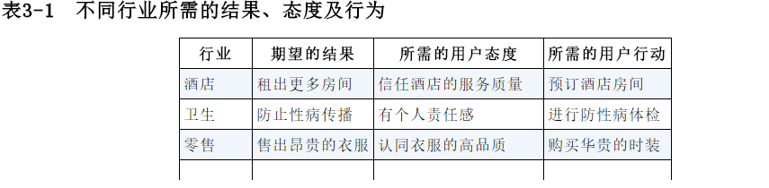 考慮怎樣做才能為你帶來(lái)想要的結(jié)果,是需要影響態(tài)度,還是影響行動(dòng),抑或需要同時(shí)影響這二者我們?nèi)砸訥rasshopper為例,該網(wǎng)站期望的結(jié)果是讓更多企業(yè)訂購(gòu)其語(yǔ)音信箱服務(wù)。那么,究竟采取何種態(tài)度或行動(dòng)才能助其實(shí)現(xiàn)這個(gè)目標(biāo)呢?當(dāng)然,首先在態(tài)度上,要讓那些作為目標(biāo)客戶的企業(yè)對(duì)Grasshopper及其服務(wù)產(chǎn)生良好的印象。比如,讓企業(yè)認(rèn)可Grasshopper并相信它提供的服務(wù)值得信賴。同時(shí),還要讓企業(yè)主采取行動(dòng):成功注冊(cè)并使用該網(wǎng)站提供的服務(wù)。當(dāng)然,你的目標(biāo)可能完全不同于Grasshopper網(wǎng)站。為了幫你拓展思路,表3-1中簡(jiǎn)要列出了幾類(lèi)網(wǎng)站的目標(biāo)及各自所需的用戶態(tài)度和行為。