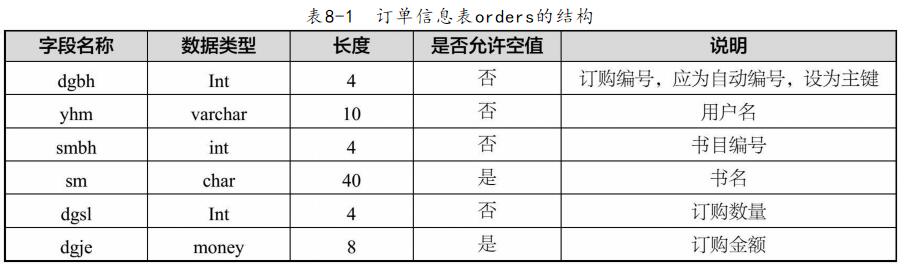 創(chuàng)建表數(shù)據(jù)庫bookstore包括以下4個表:書目信息表books、客戶信息表customers、訂單信息表orders和后臺管理員信息表admin。其中,書目信息表books、客戶信息表customers和后臺管理員信息表admin的表結(jié)構(gòu)在第4章中有詳細(xì)介紹,訂單信息表orders的結(jié)構(gòu)如表8-1所示。