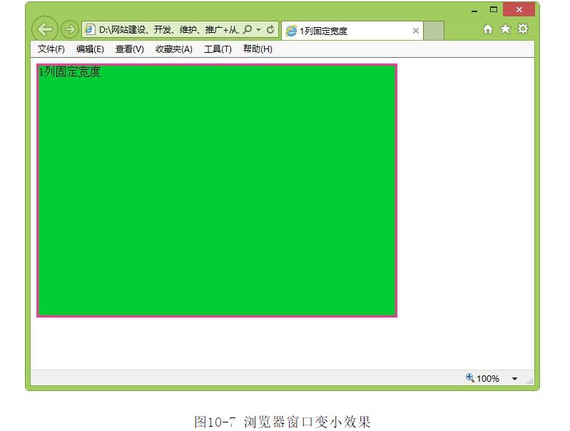 ?在瀏覽器中瀏覽,由于是固定寬度,無論怎樣改變?yōu)g覽器窗口大小,Div的寬度都不改變,如圖10-7和圖10-8所示。