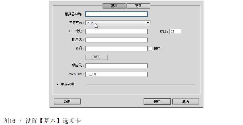 【基本】選項卡中有以下參數。服務器名稱:輸入服務器的名稱。連接方法:選擇要連接的方法,這里選擇連接FTP選項。圖16-6【站點設置對象】選項卡