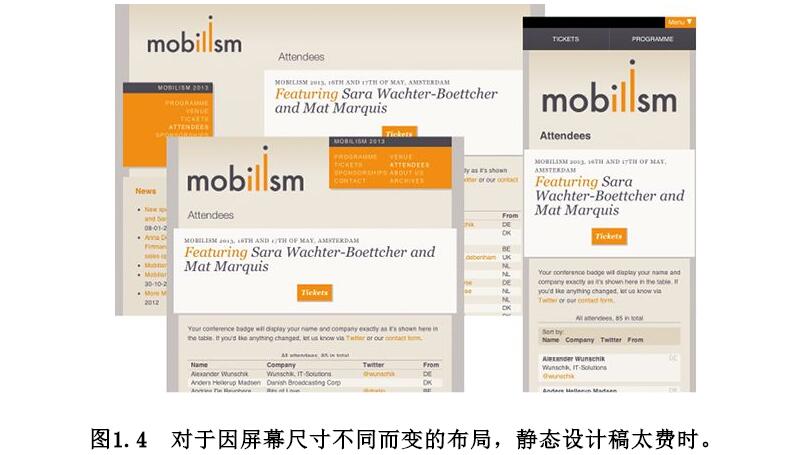 屋里的大象思維模式與交互式網(wǎng)站設(shè)計(jì)之間的關(guān)系,考慮采用全新工作流程的主要原因之一是為了響應(yīng)式設(shè)計(jì)。從本質(zhì)來看,響應(yīng)式設(shè)計(jì)讓一屏單獨(dú)的靜態(tài)頁面變得毫無意義。在圖像編輯器里創(chuàng)造的圖像不是任何瀏覽器里的頁面,更別提種類繁多的瀏覽器的背后還有更種類繁多的跨平臺(tái)多視圖(見圖1.4)。