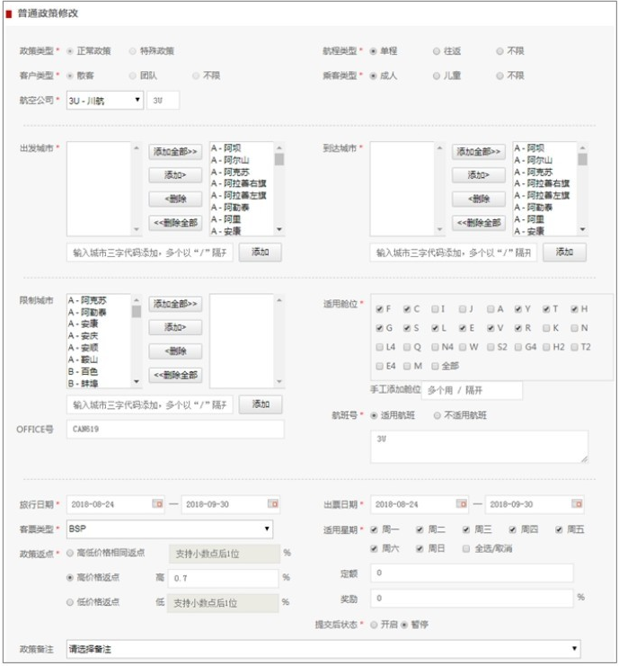 包括政策類型、客戶類型、航程類型、乘客類型、航司、航班、艙位、城市、日期、返點、定額、Office號等多種屬性。