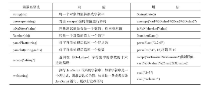 JavaScript為腳本開(kāi)發(fā)人員提供了一些函數(shù),這些函數(shù)不與任何對(duì)象關(guān)聯(lián),所以稱為全局函數(shù),并且在程序中可以直接使用。全局函數(shù)包括客戶端的和服務(wù)器端的,要使用服務(wù)器端的函數(shù),則必須把它們放在<server>…</server>標(biāo)簽對(duì)中。常見(jiàn)的客戶端全局函數(shù)的功能及用法如表5-7所示。