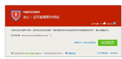 ▲安全軟件攔截并提示訪問網(wǎng)頁有害