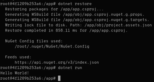 為了驗(yàn)證可行性,嘗試運(yùn)行一下dotnet restore,這個(gè)可以恢復(fù)運(yùn)行程序需要用到的所有包。這個(gè)步驟完成后,運(yùn)行dotnet run,然后你就可以在控制臺(tái)看到關(guān)鍵信息Hello,World!了。