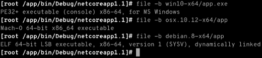 注意一下,在./app/bin/Debug/netcoreapp1.1/文件夾中每一個(gè)平臺(tái)都有對(duì)應(yīng)的目錄,每一個(gè)目錄都有對(duì)應(yīng)的publish文件夾,這個(gè)文件夾里有你的本地應(yīng)用程序的副本,還有所有需要運(yùn)行的.NET庫(kù)的副本,所有沒(méi)必要在目標(biāo)系統(tǒng)上安裝.NET,只需要把這些文件復(fù)制到一個(gè)新的文件夾然后運(yùn)行可執(zhí)行文件就好了。