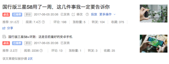 差不多就是上面一些套路,現(xiàn)在還有一些自媒體平臺(tái),是支持雙標(biāo)題的,我們就可以利用這樣的工具,其實(shí)每一次同一個(gè)文章起兩個(gè)標(biāo)題,經(jīng)??偨Y(jié)它,你就發(fā)現(xiàn)什么標(biāo)題其實(shí)確實(shí)是經(jīng)得起市場(chǎng)考驗(yàn)的。我們最近就寫了一篇三星S8 的評(píng)測(cè)文章,起了兩個(gè)標(biāo)題,第一個(gè)是《國(guó)行版三星S8 用了一周,這幾件事我一定要告訴你》,這個(gè)標(biāo)題就明顯好于《國(guó)行版三星S8 評(píng)測(cè),這是目前最好的安卓手機(jī)》,為什么?因?yàn)楹竺孢@個(gè)太普通了,而且什么都說得太明白了,用戶一看就知道你這篇文章就是要吹三星S8 嘛,但是第一個(gè)標(biāo)題,他就會(huì)想,你到底是想說它的好處還是壞處?你肯定是有幾點(diǎn)特別重要的事情想跟我分享,而且前面還用了三星用了一周,就顯得很實(shí)際。第一個(gè)比第二個(gè)標(biāo)題好得多,沒那么空,總之大家起標(biāo)題的時(shí)候,不妨多試試。因?yàn)橐郧捌鹆藰?biāo)題定了之后發(fā)出去,就是沒有對(duì)比,現(xiàn)在可以通過一些小工具作為對(duì)比。