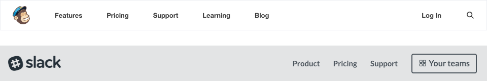 例如企業(yè)郵件應(yīng)用Mailchimp和Slack就是扁平結(jié)構(gòu)的典型代表,它們的導(dǎo)航都只有一級(jí),把所有頁(yè)面入口都放在外面,最重要的功能、定價(jià)位于前兩個(gè)位置,其余的根據(jù)重要性遞減排列,最右邊一般會(huì)放注冊(cè)或登陸入口: