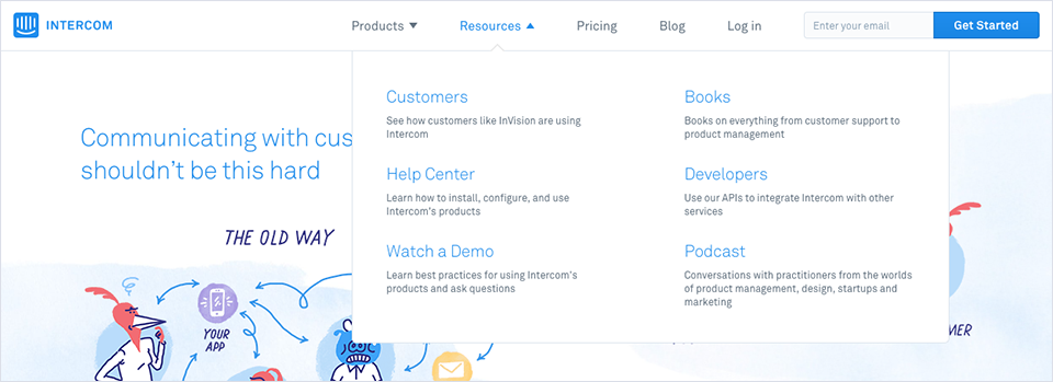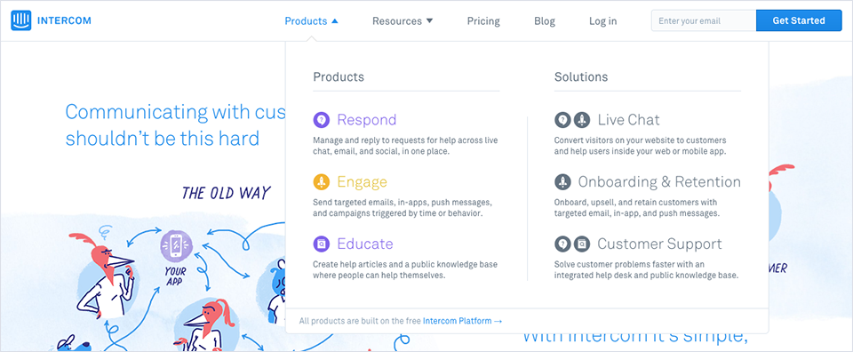 以Intercom為例,它是一款大型CRM應(yīng)用,公司旗下有三大子產(chǎn)品。官網(wǎng)首頁(yè)設(shè)置了 5 個(gè)一級(jí)導(dǎo)航,其中前兩個(gè)是折疊導(dǎo)航。最重要的Products導(dǎo)航的下拉菜單中按照產(chǎn)品和解決方案兩個(gè)維度展示了對(duì)應(yīng)的信息。配合icon和簡(jiǎn)介,有序又直觀:
