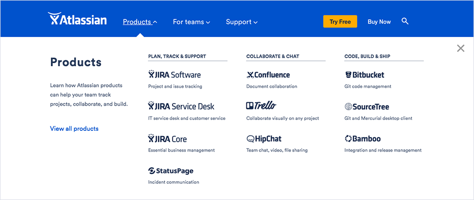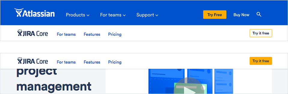 再看看Atlassian的設(shè)計(jì)。到達(dá)子產(chǎn)品頁(yè)后會(huì)保留主導(dǎo)航,隨著頁(yè)面滾動(dòng),子產(chǎn)品導(dǎo)航會(huì)把主導(dǎo)航推出,繼而代替主導(dǎo)航的位置: