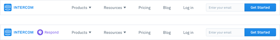 繼續(xù)以Intercom為例,首頁(yè)導(dǎo)航在滾動(dòng)時(shí)保持常駐。當(dāng)點(diǎn)擊首頁(yè)導(dǎo)航到達(dá)子產(chǎn)品頁(yè)面后,導(dǎo)航保持一致,只是在原先的主LOGO旁多了一個(gè)子產(chǎn)品LOGO來(lái)表明當(dāng)前所在頁(yè)面,點(diǎn)擊主LOGO可以返回首頁(yè):