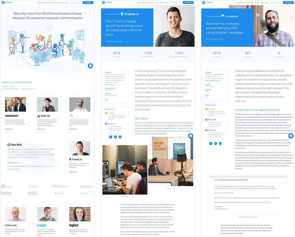Intercom在客戶故事這方面下足了功夫,每個(gè)重點(diǎn)客戶都有內(nèi)容豐富的專題頁(yè),里面有客戶公司簡(jiǎn)介,描述了用Intercom的哪些產(chǎn)品解決了哪些問題,有從他們產(chǎn)品角度出發(fā)的第三人稱描述,也有客戶的第一人稱陳述: