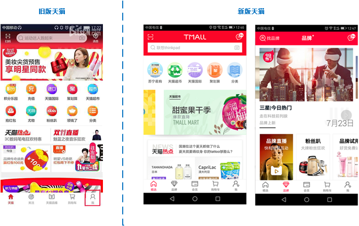 新版天貓APP:與舊版相比,改版后的天貓的意圖已經(jīng)非常明顯:為追求品質(zhì)的人群提供品質(zhì)商品。因此整個(gè)APP從原來那種色彩鮮艷,玲瑯滿目的風(fēng)格,轉(zhuǎn)變成了簡約清爽,且以品牌內(nèi)容為主的風(fēng)格