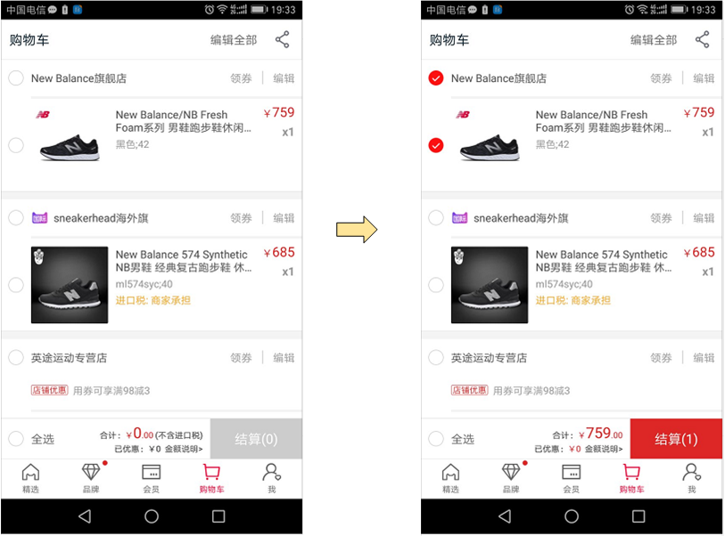 第二張圖:刻意創(chuàng)造視覺感知的差異,吸引用戶視覺焦點(diǎn),告知或者引導(dǎo)用戶點(diǎn)擊。比如【商品選擇按鈕】顏色和底色差異,【結(jié)算按鈕】配色選擇及大小設(shè)定。