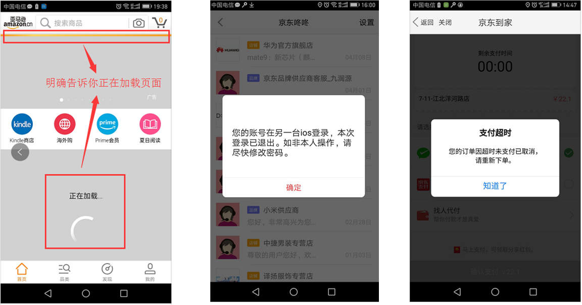 通常涉及按鈕操作后的顏色變化,加載頁面時(shí)的動畫提示,異常問題出現(xiàn)時(shí)的原因告知等等,這些都是很常見的,非常容易理解的用戶體驗(yàn)。老龍就不再詳細(xì)描述了,舉幾個(gè)最常見的例子,大家一看就明白: