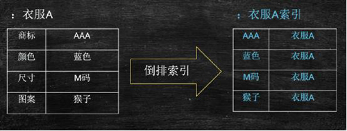 假設檢索系統(tǒng)中只有一個商品——衣服A,基于該商品構(gòu)建其倒排索引結(jié)構(gòu)之后,會產(chǎn)生上圖右表中的索引結(jié)構(gòu),這樣用戶可以通過搜“AAA”,“藍色”,“M碼”,“猴子”,均可找到該商品,加快了檢索速度,擴大了檢索范圍。