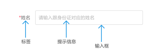 一個(gè)輸入框,通常有標(biāo)簽名稱label、提示信息placeholder(輸入信息后提示文字消失)、初始值value(需手動(dòng)刪除)。如果是必填表單,在適當(dāng)位置(標(biāo)簽的前后,輸入框后)加上紅色*號(hào)(或其他符號(hào))。