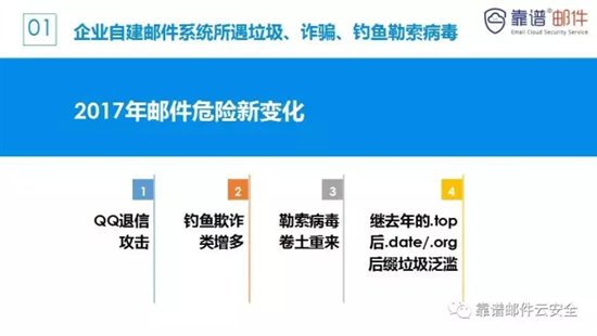 首先靠譜郵件發(fā)言人簡(jiǎn)潔明了地講解了關(guān)于企業(yè)自建郵件系統(tǒng)所遇垃圾、詐騙、釣魚(yú)勒索病毒的常見(jiàn)問(wèn)題,并分享了關(guān)于 2017 年郵件危險(xiǎn)新變化。