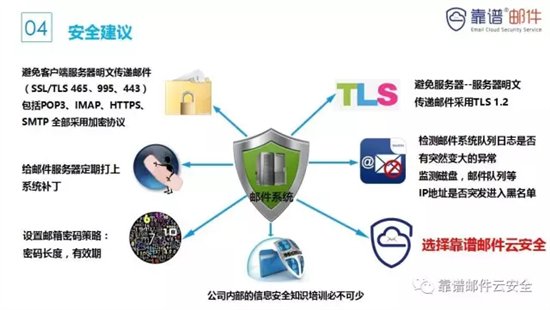 最后,從郵件安全設(shè)置、服務(wù)器安全、賬號(hào)密碼策略、日常監(jiān)測(cè)郵件狀態(tài)及郵件安全知識(shí)培訓(xùn)這幾個(gè)方面,為各企業(yè)IT運(yùn)維人員提出具體可行的解決方案。