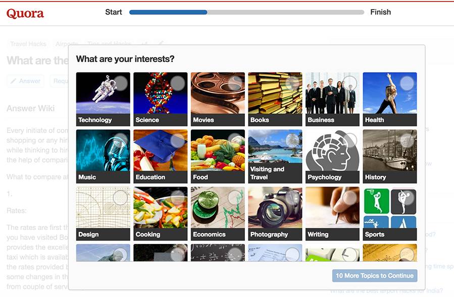 Quora(外國知乎)為例,注冊時會讓用戶選擇關(guān)鍵詞,會根據(jù)這個詞擴展出相關(guān)詞匯,這樣用戶進入首頁時,能看到與自己選擇相關(guān)的全部信息,增強對產(chǎn)品的好感和使用黏度;