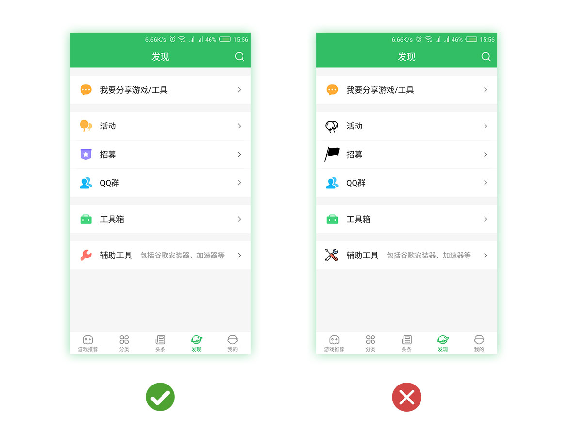 在決定使用某一風(fēng)格的圖標(biāo)設(shè)計(jì)之后,在相同木塊下,請(qǐng)盡量使用同一的風(fēng)格的圖標(biāo),如填充圖標(biāo)的色彩飽和度;線性圖標(biāo)的線條粗細(xì);擬物風(fēng)格的光線陰影等。