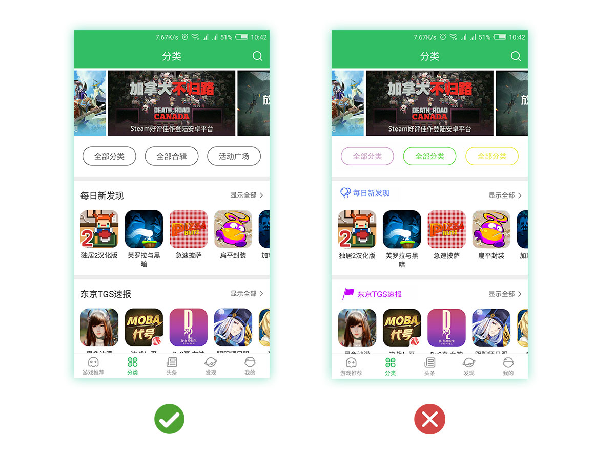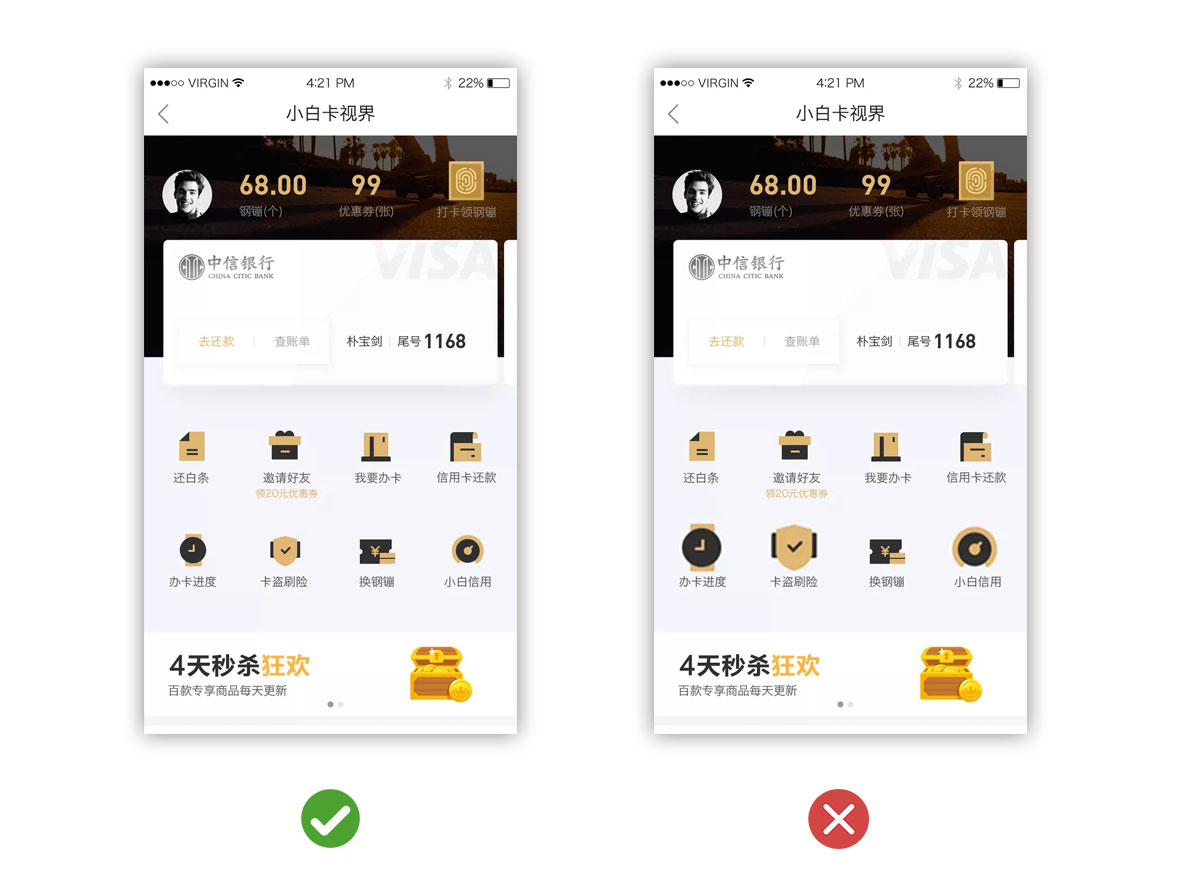通過(guò)圖標(biāo)(按鈕)的顏色、大小、風(fēng)格等來(lái)引導(dǎo)用戶進(jìn)行操作,需要強(qiáng)化的就要做得突出,不要整個(gè)界面都處于主次不明的狀態(tài),分散用戶的注意力,削弱了界面需要傳達(dá)的主旨。