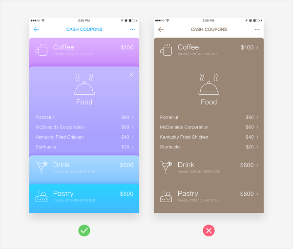 界面設(shè)計(jì)中不乏內(nèi)容信息很多,需要折疊的情況。因此經(jīng)常存在信息的層級(jí)關(guān)系,而這時(shí)就需要利用不同的顏色對(duì)各個(gè)模塊進(jìn)行區(qū)分,利用同色系不同明度來(lái)體現(xiàn)這樣的層級(jí)關(guān)系。這樣也讓用戶更容易理解當(dāng)前所處的模塊。也讓頁(yè)面看起來(lái)更豐滿些。