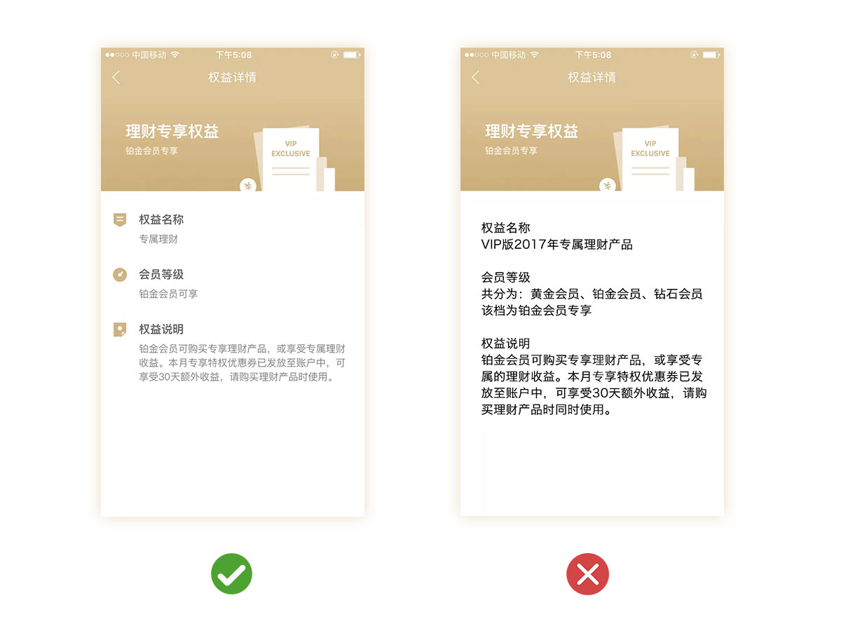 工作中我們拿到的需求總會(huì)出現(xiàn)大篇幅的文案,不能像概念設(shè)計(jì)那樣任性的刪減,在進(jìn)行文字排版的時(shí)候,正確的處理信息之間的層級(jí)關(guān)系將會(huì)提高用戶對(duì)信息的識(shí)別度。我們通常會(huì)通過(guò)字體大小、顏色、留白、層級(jí)分割等技巧來(lái)處理,把相同屬性的信息歸類(lèi)設(shè)計(jì),通過(guò)留白的不同達(dá)到層級(jí)的區(qū)分,讓整個(gè)信息排列主次分明,層級(jí)清晰。